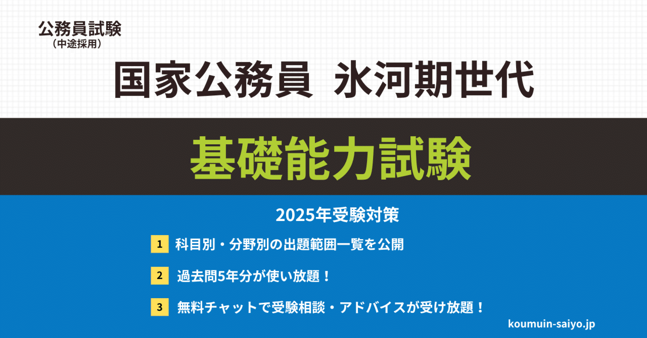 本記事では、国家公務員中途採用者選考試験(就職氷河期世代)の基礎能力試験の過去問を扱いやすいPDF形式でまとめています。ぜひ参考にしてください。